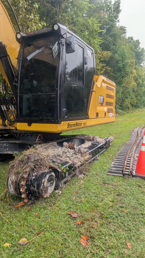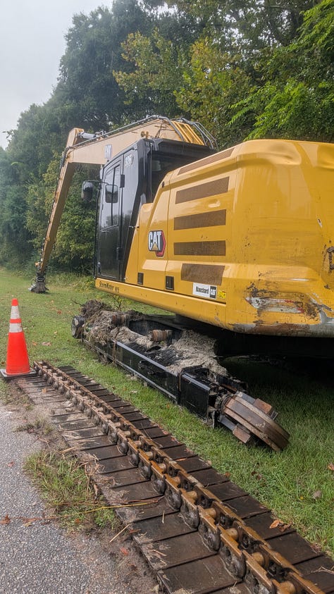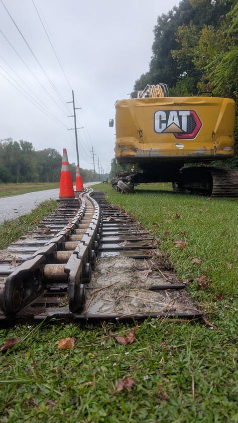 And today on the run, I saw this huge machine used for clearing the sides of the canal. One of the tracks sitting on the side. The machine sitting there, not able to do any work because one of the tracks came off somehow.